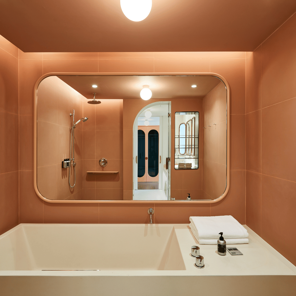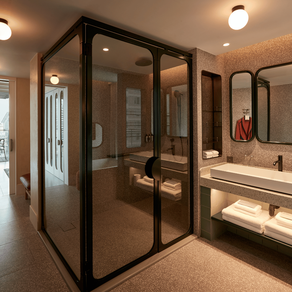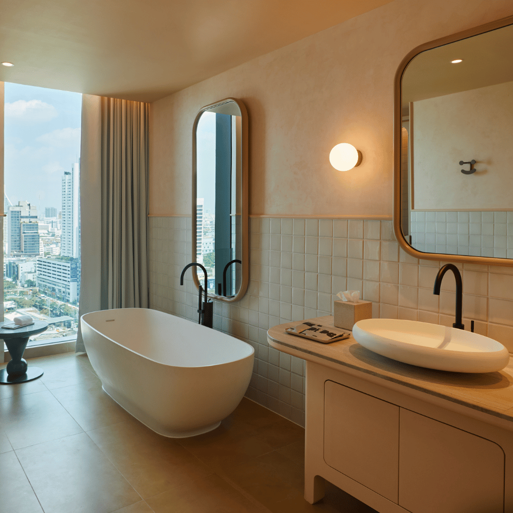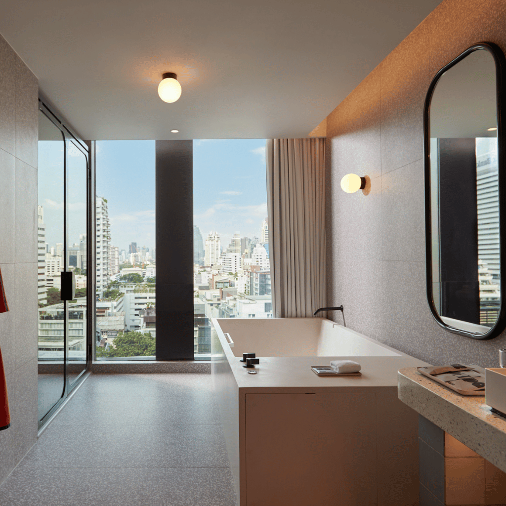 More space to breathe, plus your choice of a rain shower or deep soaking tub. The city views from the bathroom are a nice touch.